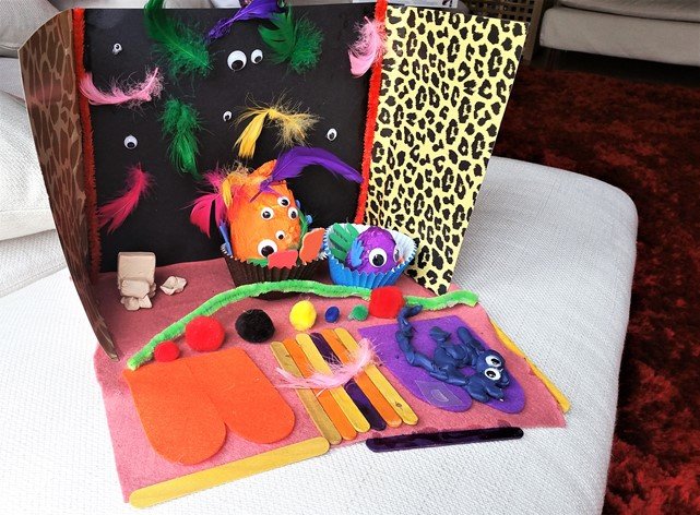 - Finally, decorate your back wall with whatever decorations you can find. As this is a monster house, we decorated ours with colourful feathers and lots of googly eyes!