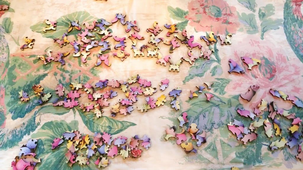 Lots of disorganised jigsaw piece placement and a barrel of laughs later, we decided that it would probably be best to organise and section the pieces according to shape.