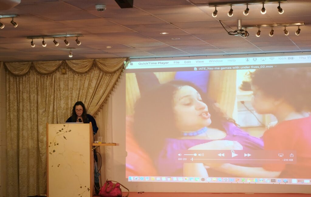 The key here is to stay animated, copy the expression the child is using and any actions that may follow. For example, if the child goes under the table, you follow them. We watched a clip from one of the DVDs, where the mother was copying the child’s movements and the child was giggling with enthusiasm.