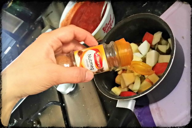 Apple Pie is so cheap and easy to make when you already have Jus Rol puff pastry dough to hand. I even changed it up a bit and added pear to the equation and all it cost me was one apple, one pear, some sugar and some nutmeg. I ended up making enough little Apple/Pear Pies to serve at a mini birthday lunch at my friend’s house. It’s so easy to make, here are the steps: