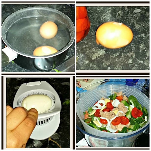 At this point, I would check the eggs, which should be hard boiled by now. Pour out the hot water and immediately refill the pan with cold water to set the eggs for peeling. Use an egg slicer to slice the eggs and place in the Good Grips Salad Spinner.