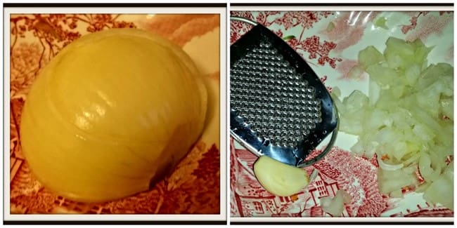 Take half an onion and chop in half before placing in the Good Grips Chopper to chop the onions finely. Add to the Good Grips Salad Spinner. Grate a clove of garlic with a grater and place in the Good Grips Salad Spinner. Save ¼ of the onions and garlic for the salad dressing.