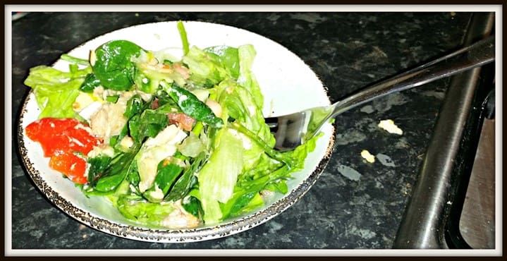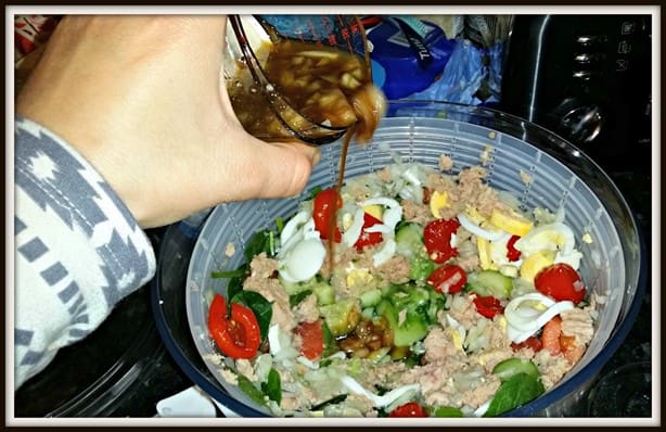 When you are ready to serve the salad, pour the salad dressing over the salad.