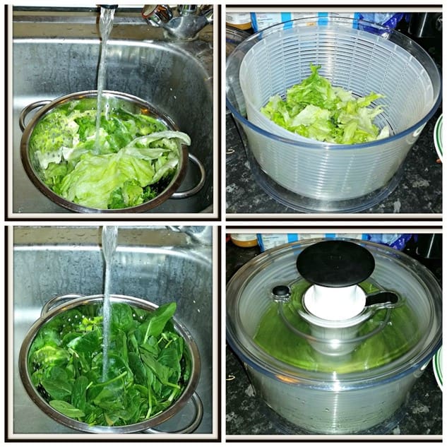 Wash and tear the lettuce and spinach, and add to the Good Grips Salad Spinner.