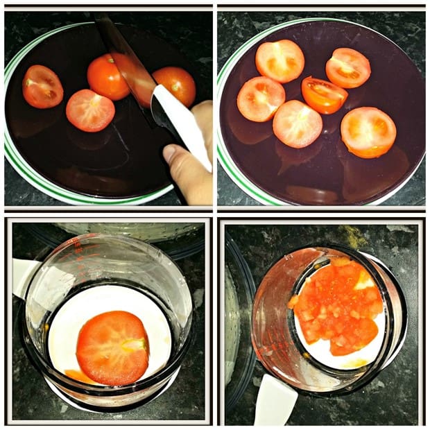 Grab the tomatoes and half them before placing them in the Good Grips Chopper to chop them up nicely into little pieces. Place in the Good Grips Salad Spinner.