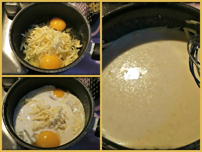 Add 2 eggs and whisk together with cream and cheese.