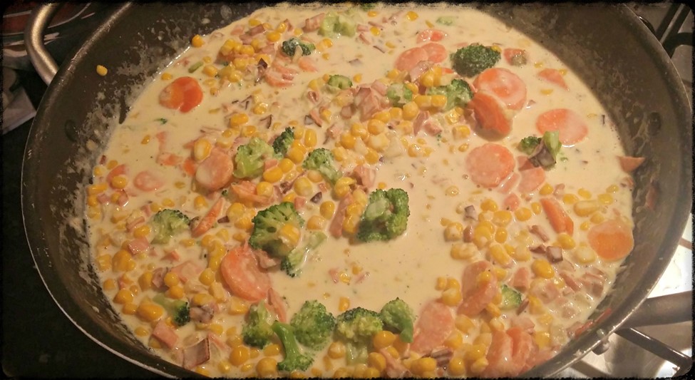 Cook through, pour half the crème from the Carnation Cook with it sauce into the pan.