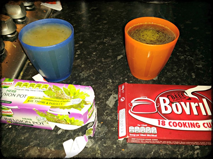 - Dissolve 1 beef stock and one herb flavour pot in 1 cup of water each.