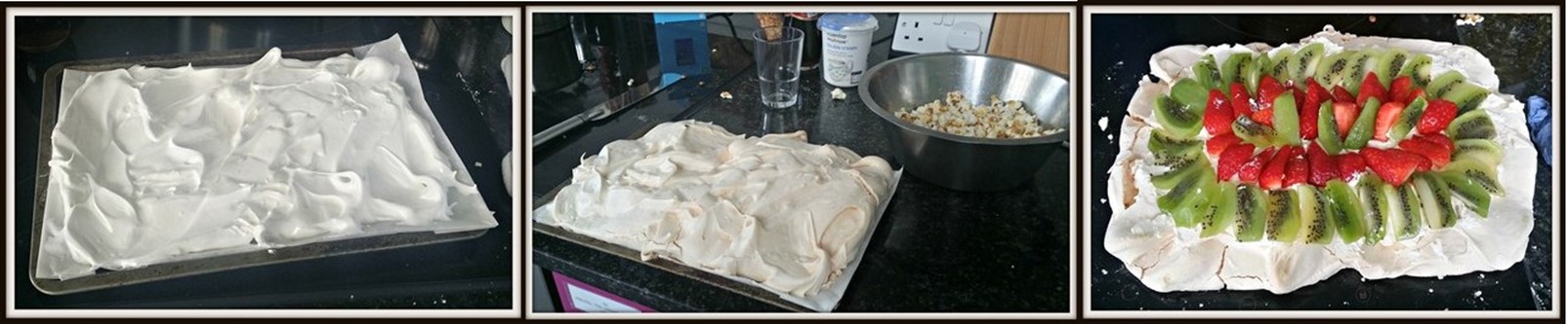 This was going to be my favourite recipe, I just knew it. I love Pavlovas, but I have never made them before. I was very surprised to learn that you add vinegar to the recipe, which I later found out was common knowledge for most folk. Adding cornflour folded in at the last minute ensures that the inside of the Pavlova is all soft and chewy and having known before that Pavlovas were round desserts, we ended up making a rectangular version instead. I really struggled with making the cream, twice overbeating the eggs, resulting in curdled cream. Nick took pity on me and helped me make the third batch, which thankfully came out all nice and fluffy.